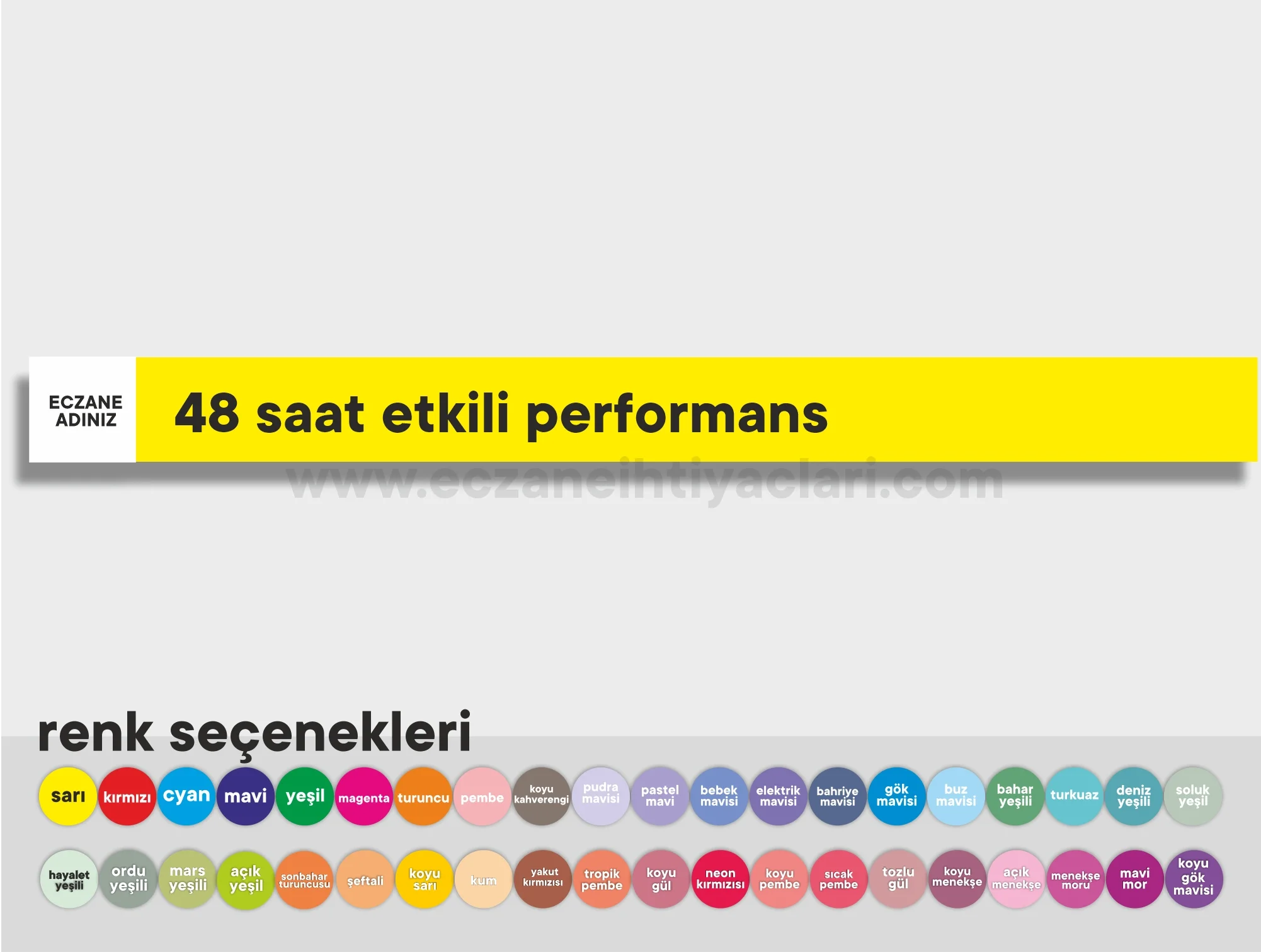 3.9x50cm ebatinda eczanenize özel raf yazısı, Raf boyutunuza göre istediğiniz ölçüde ve dilediğiniz renkte hazırlanabilir.