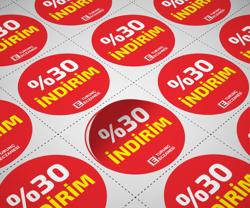 4x4 cm ölçülerindeki bu özel tasarım %30 indirim etiketi, eczane isminiz veya logonuzla kişiselleştirilir. Gıda takviyeleri, dermokozmetik ürünler, kampanyalı ürünler ve raf etiketlemeleri için idealdir.
