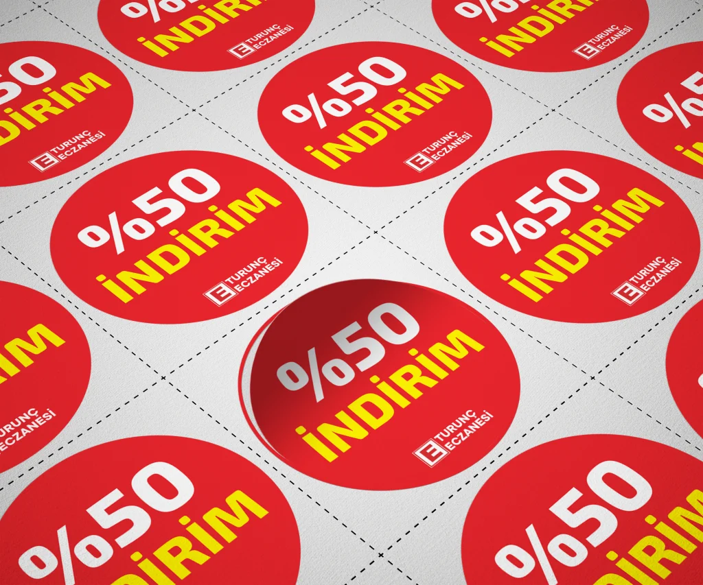 4x4 cm ölçülerindeki bu özel tasarım %50 indirim etiketi, eczane isminiz veya logonuzla kişiselleştirilir. Gıda takviyeleri, dermokozmetik ürünler, kampanyalı ürünler ve raf etiketlemeleri için idealdir.