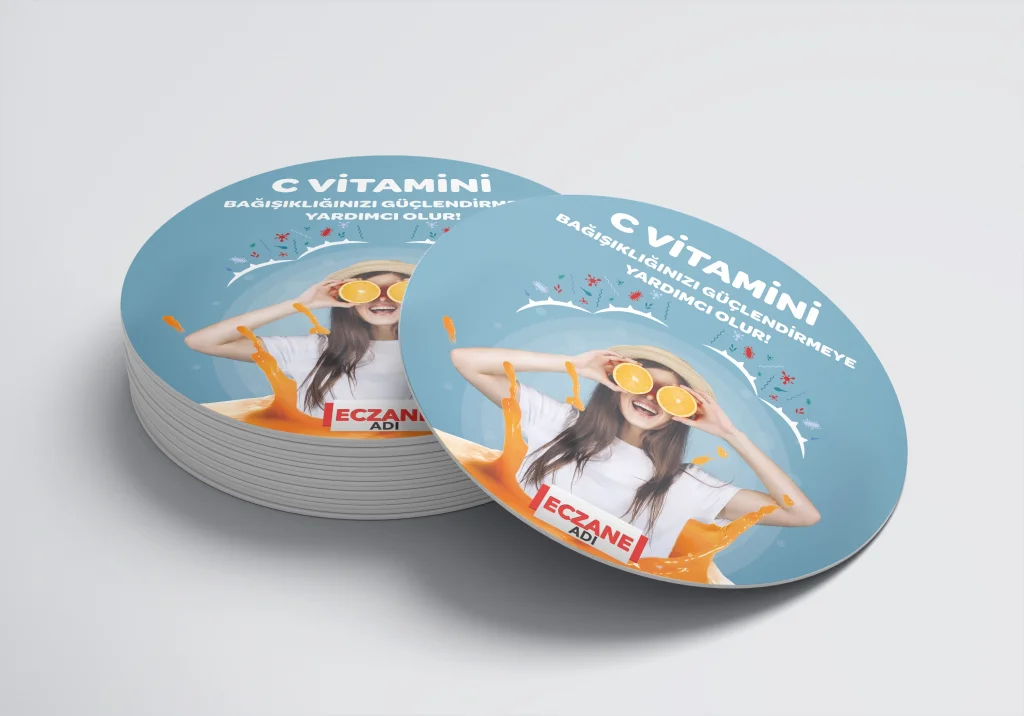 Eczanenize Özel dönkart daire şeklinde, 35x35 cm ebatında ve ön-arka yüzü baskılı şekilde üretilmektedir.