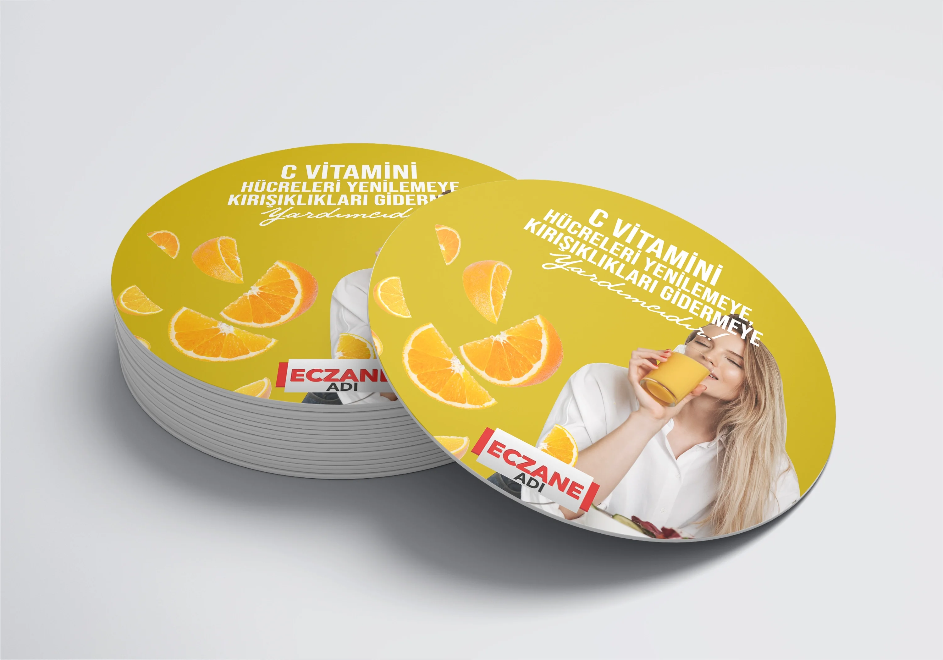 Eczanenize Özel dönkart daire şeklinde, 35x35 cm ebatında ve ön-arka yüzü baskılı şekilde üretilmektedir.