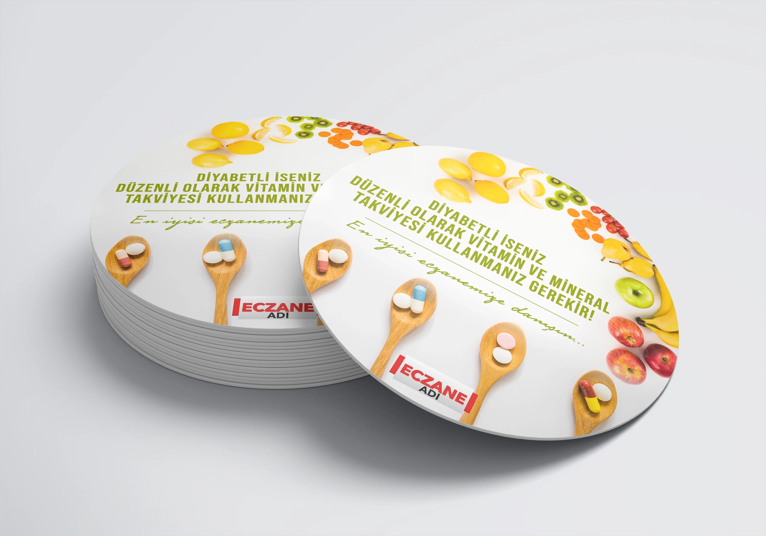 Eczanenize Özel dönkart daire şeklinde, 35x35 cm ebatında ve ön-arka yüzü baskılı şekilde üretilmektedir.