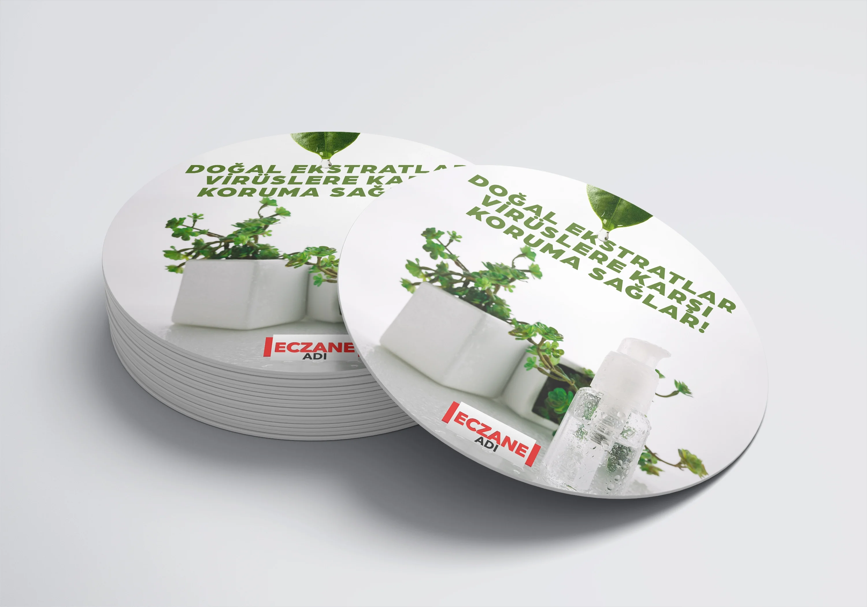 Eczanenize Özel dönkart daire şeklinde, 35x35 cm ebatında ve ön-arka yüzü baskılı şekilde üretilmektedir.