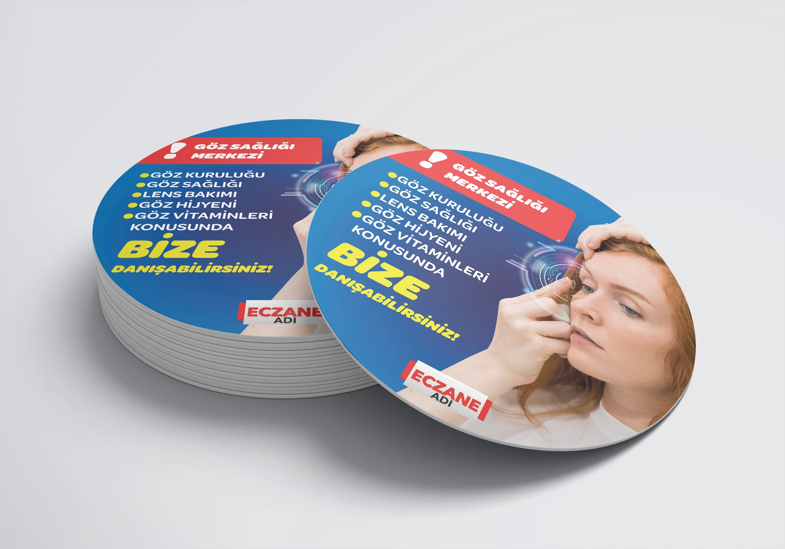 Eczanenize Özel dönkart daire şeklinde, 35x35 cm ebatında ve ön-arka yüzü baskılı şekilde üretilmektedir.