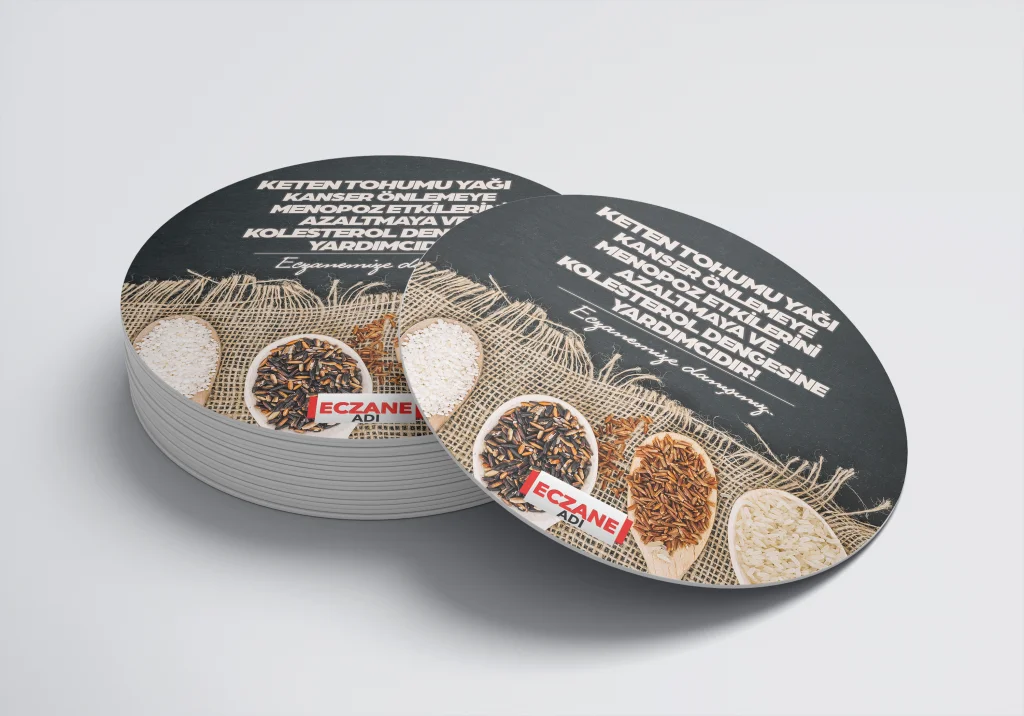 Eczanenize Özel dönkart daire şeklinde, 35x35 cm ebatında ve ön-arka yüzü baskılı şekilde üretilmektedir.