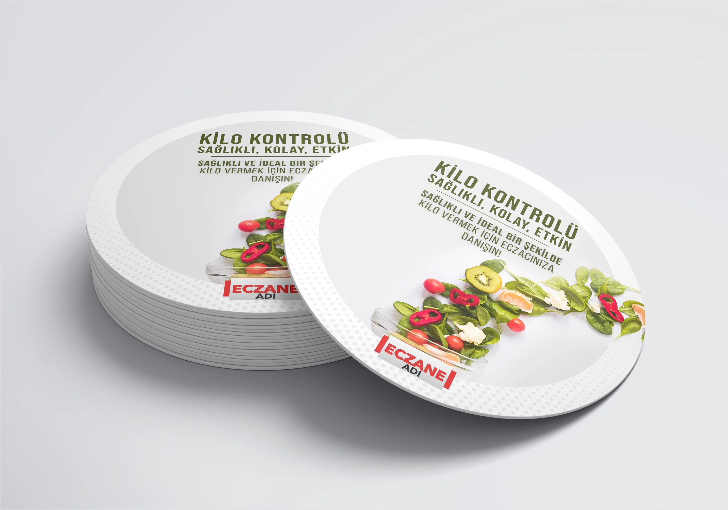 Eczanenize Özel dönkart daire şeklinde, 35x35 cm ebatında ve ön-arka yüzü baskılı şekilde üretilmektedir.