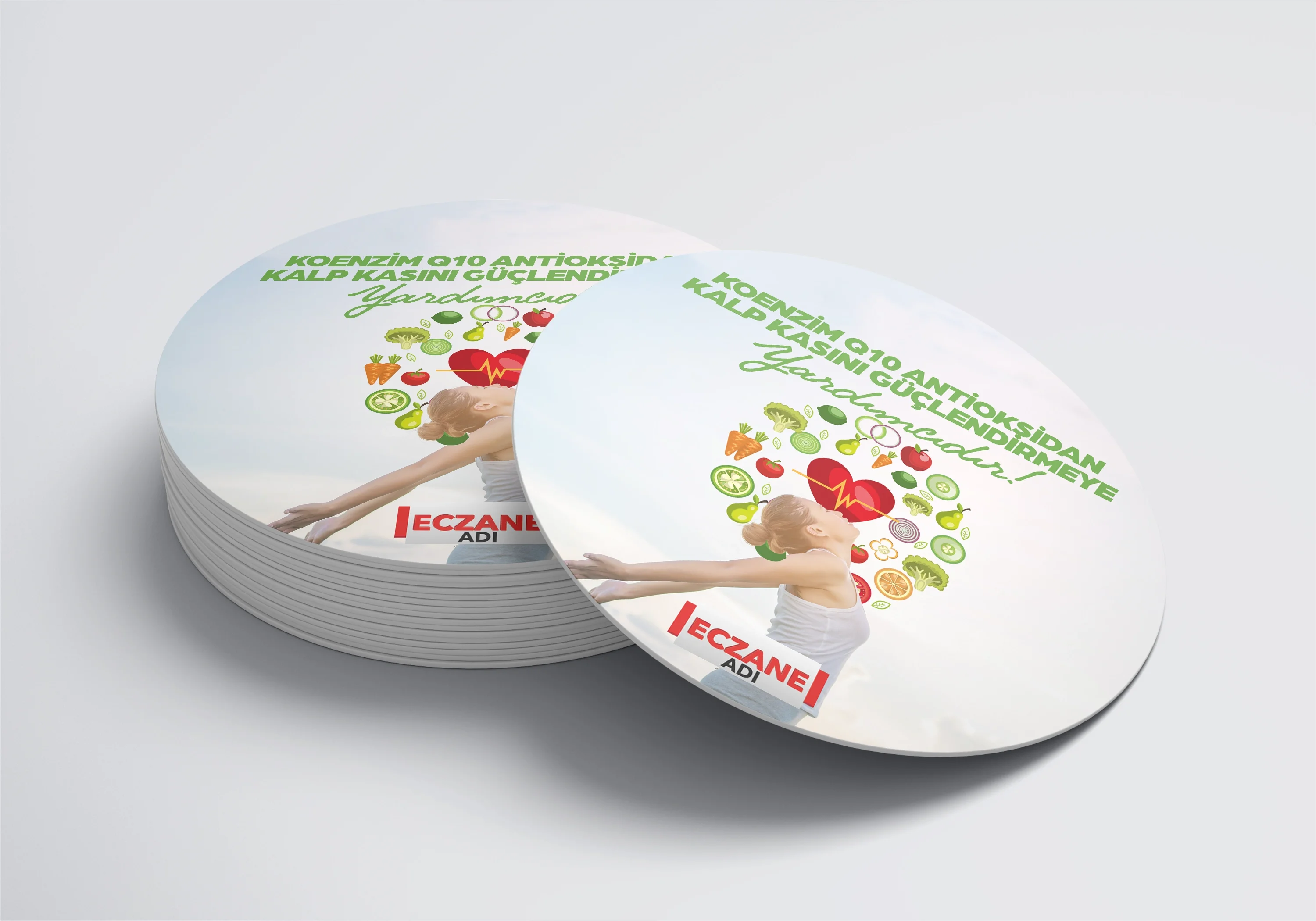 Eczanenize Özel dönkart daire şeklinde, 35x35 cm ebatında ve ön-arka yüzü baskılı şekilde üretilmektedir.