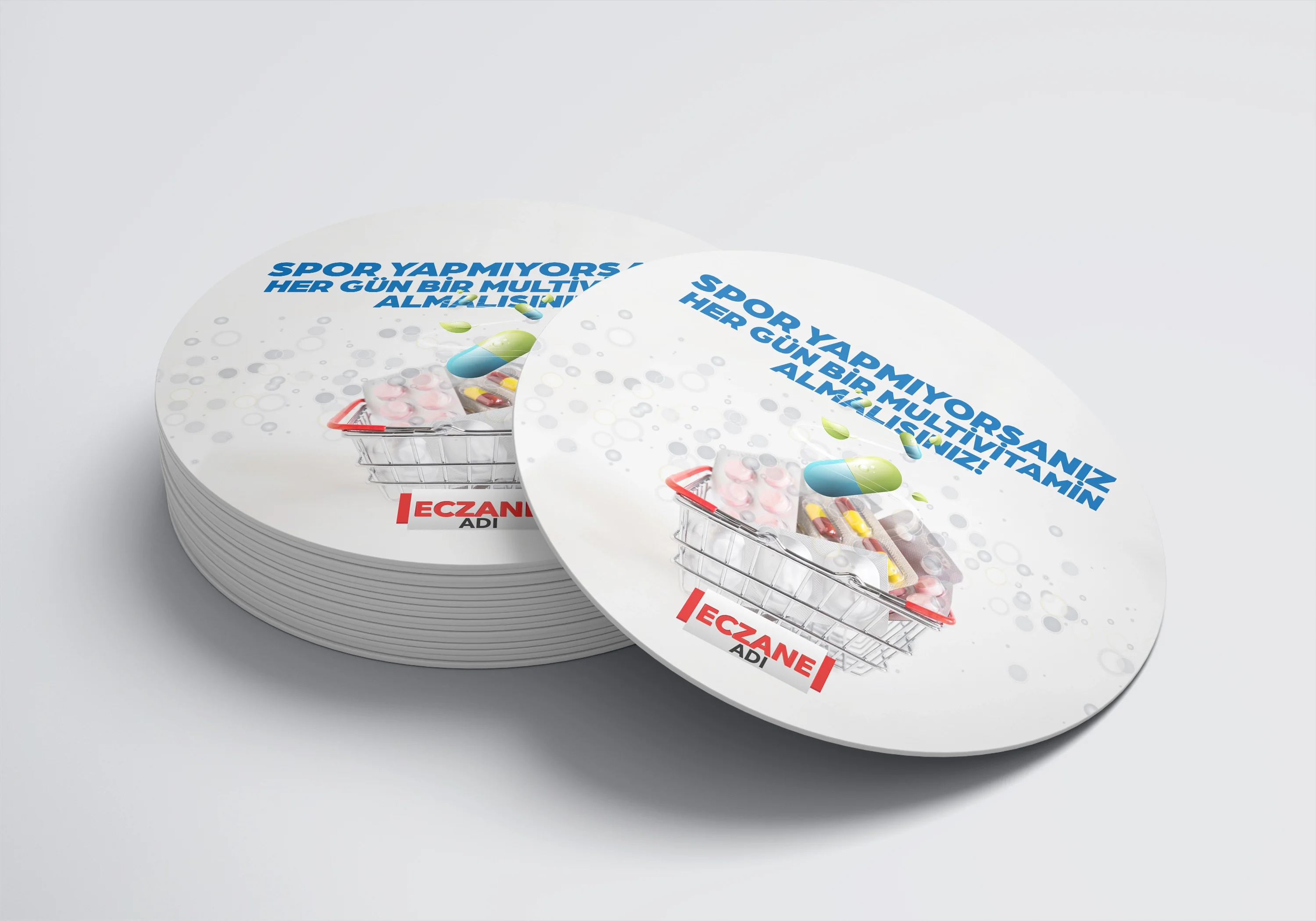 Eczanenize Özel dönkart daire şeklinde, 35x35 cm ebatında ve ön-arka yüzü baskılı şekilde üretilmektedir.
