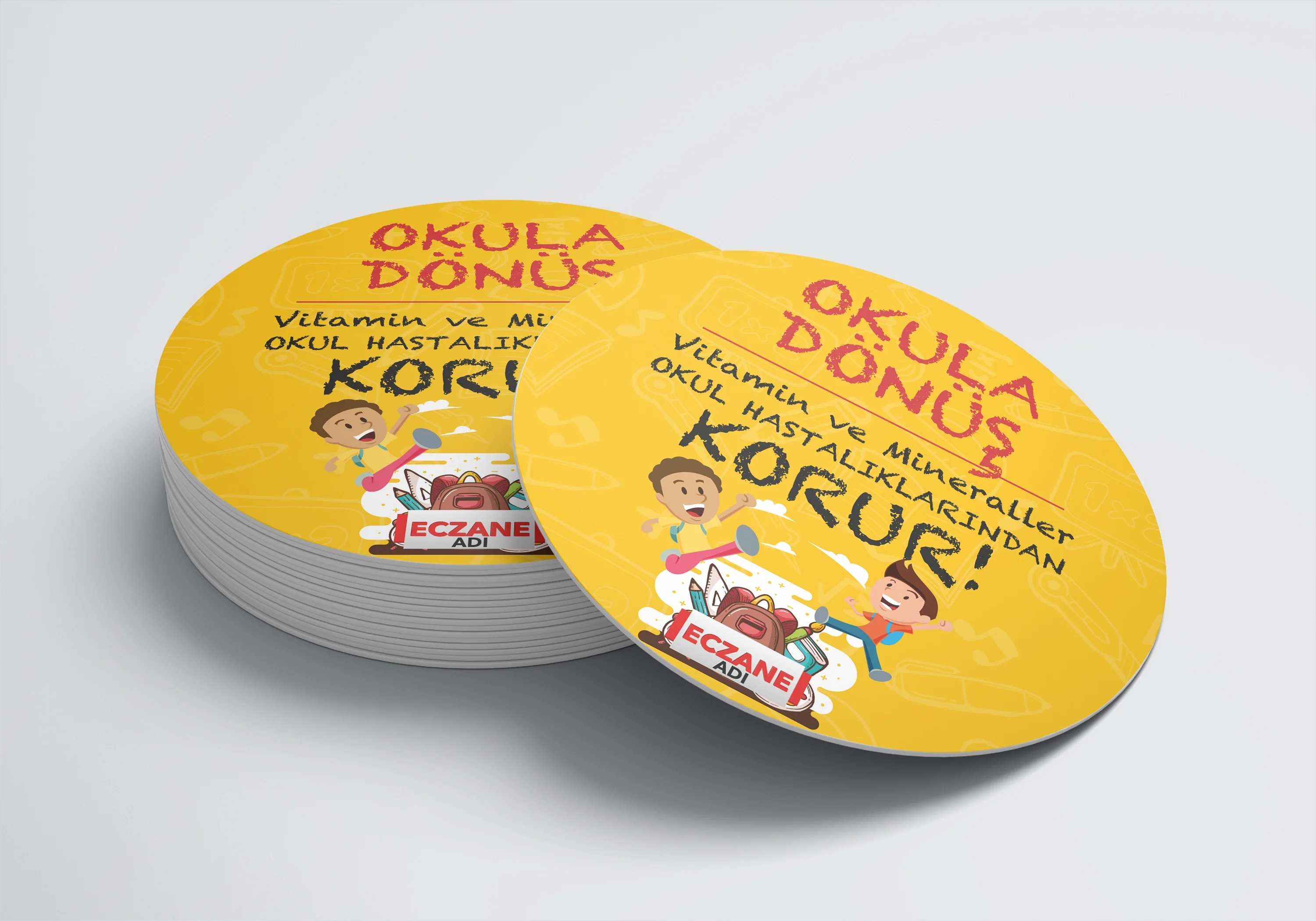Eczanenize Özel dönkart daire şeklinde, 35x35 cm ebatında ve ön-arka yüzü baskılı şekilde üretilmektedir.