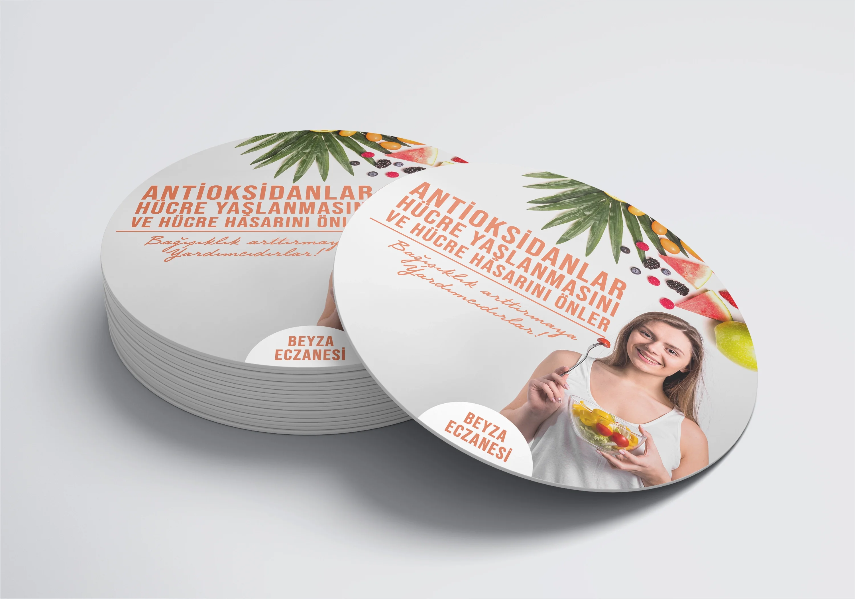 Eczanenize Özel dönkart daire şeklinde, 35x35 cm ebatında ve ön-arka yüzü baskılı şekilde üretilmektedir.