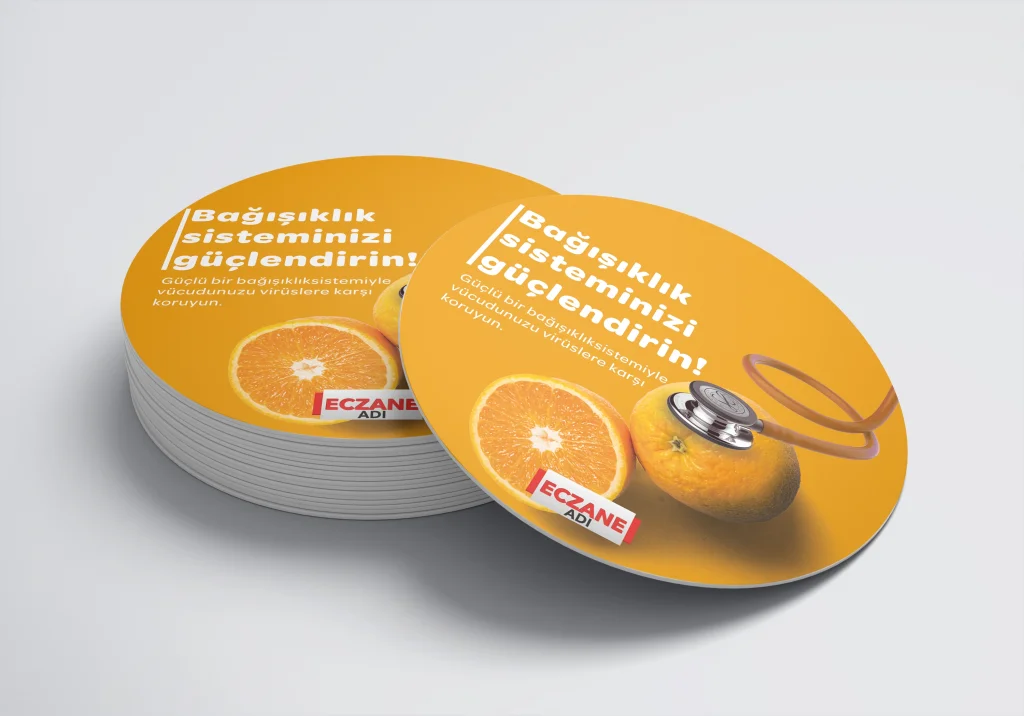 Eczanenize Özel dönkart daire şeklinde, 35x35 cm ebatında ve ön-arka yüzü baskılı şekilde üretilmektedir.