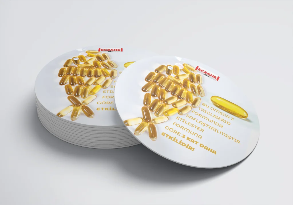 Eczanenize Özel dönkart daire şeklinde, 35x35 cm ebatında ve ön-arka yüzü baskılı şekilde üretilmektedir.