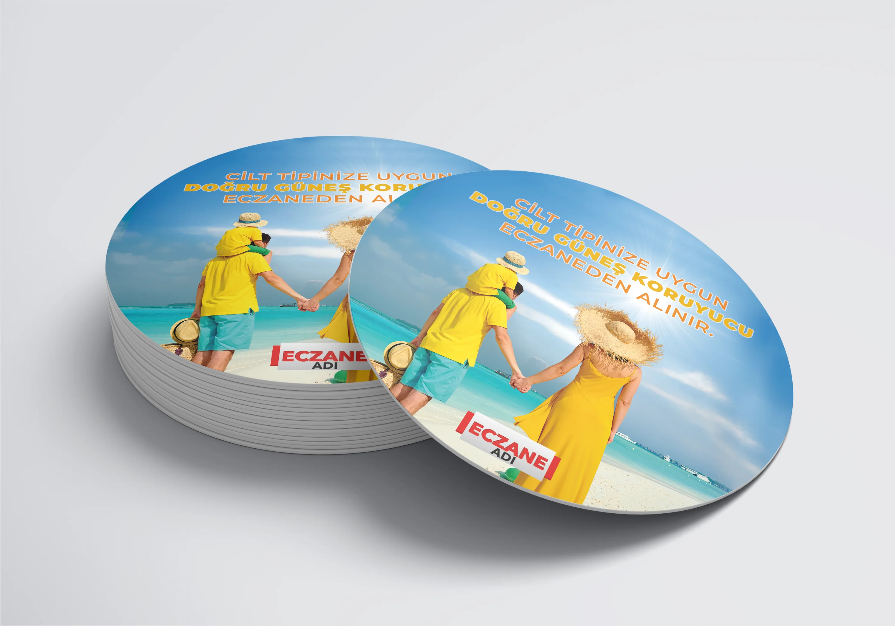 Eczanenize Özel dönkart daire şeklinde, 35x35 cm ebatında ve ön-arka yüzü baskılı şekilde üretilmektedir.