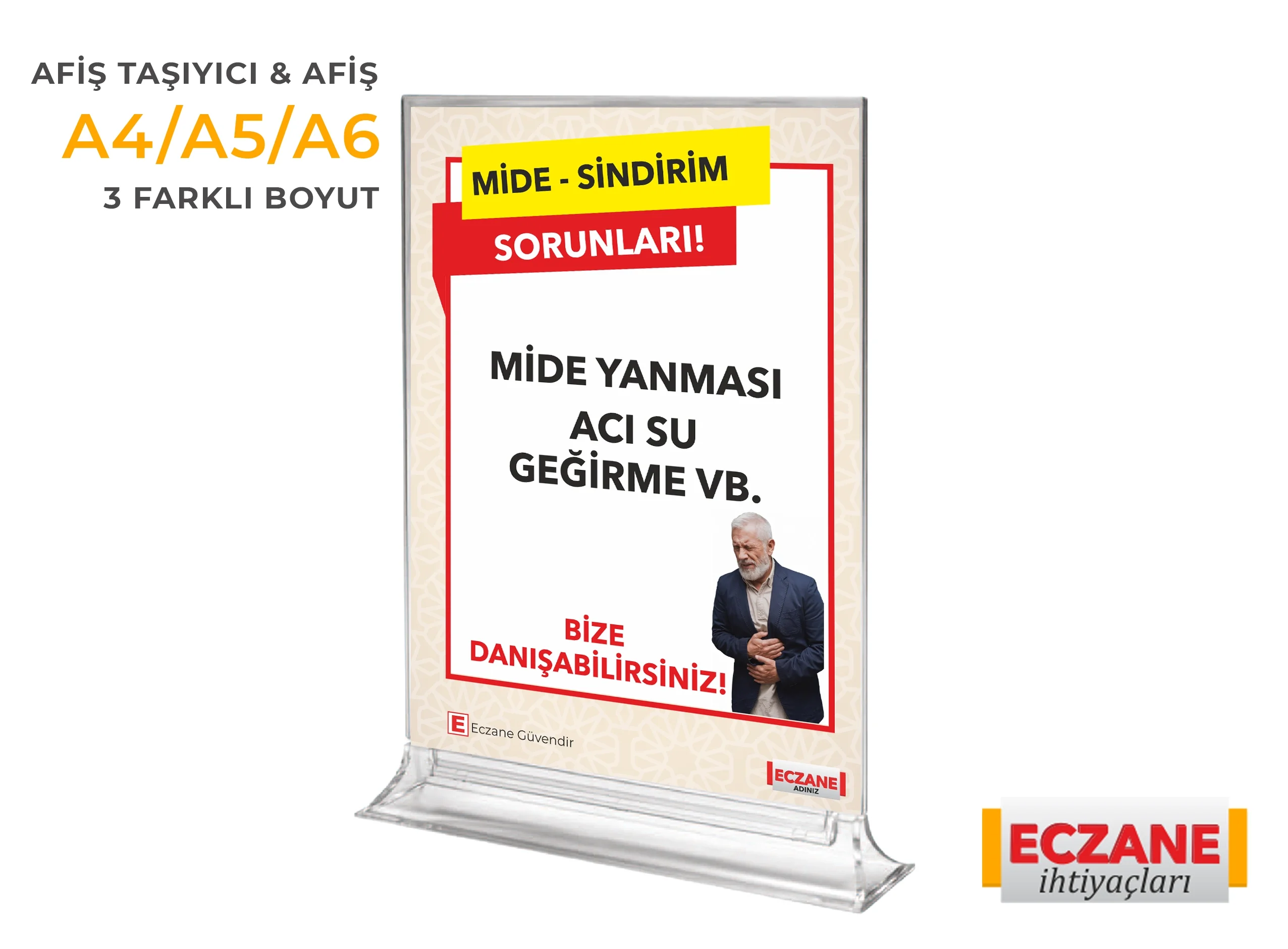 Mide Konforu Eczane Destek Afişi + A4 – A5 – A6 L ve T Tipi Afiş Taşıyıcı