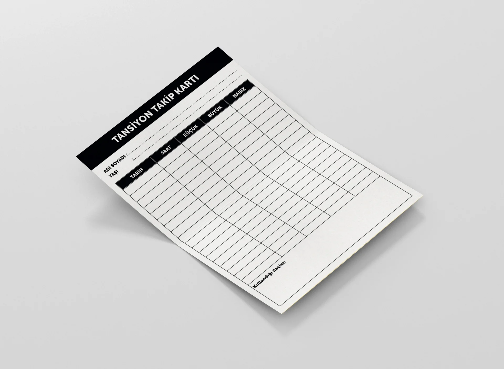 Kart üzerinde hasta adına özel isim alanı ve hedeflenen tansiyon değerlerini işaretleyebileceğiniz bölümler yer alır. Bu sayede hastalarınız ölçümlerini kolayca kaydeder, siz de takip süreçlerinde daha etkin yönlendirme yapabilirsiniz.